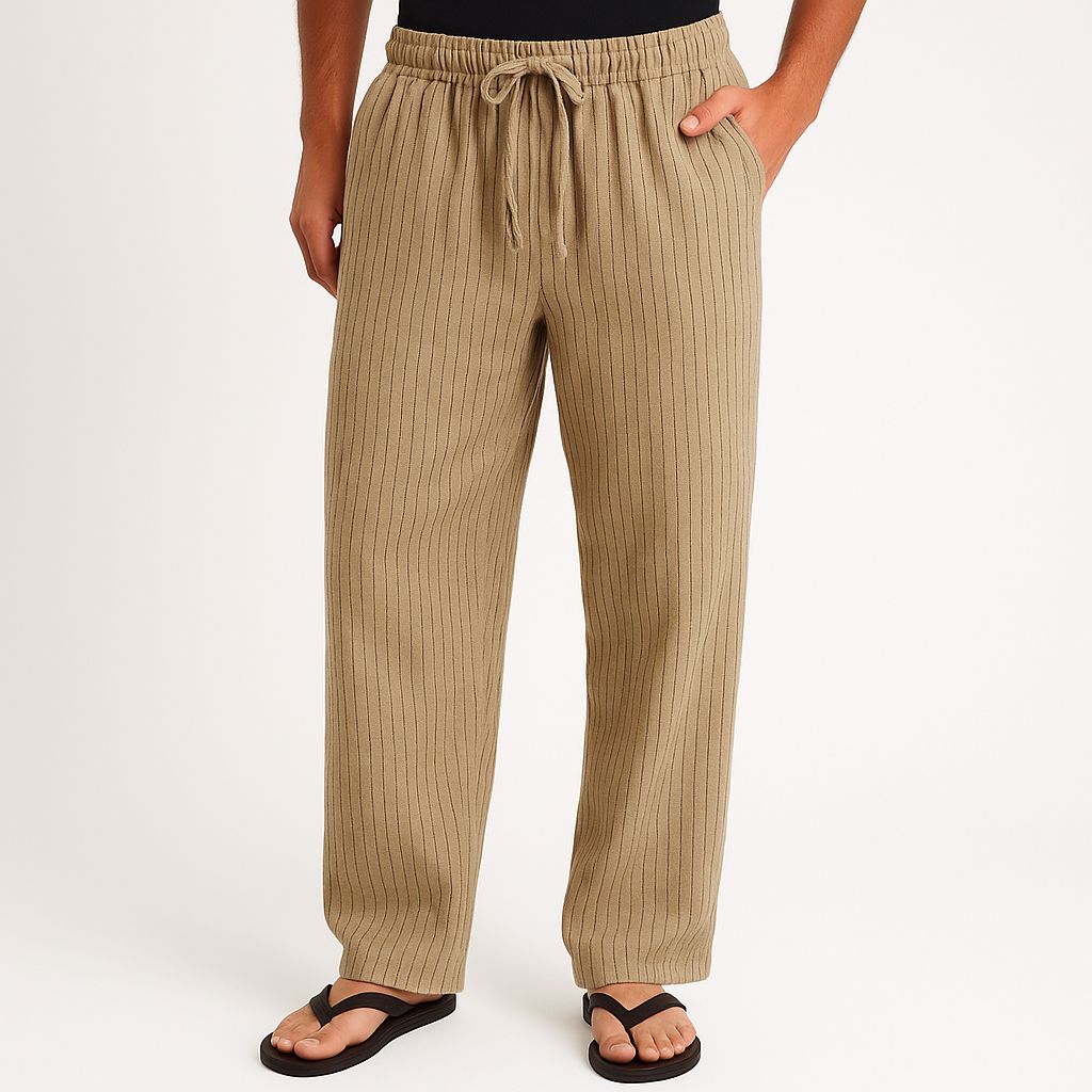 Stay cool and stylish with these men’s striped linen drawstring trousers, designed for comfort and effortless summer style. Made from breathable, lightweight linen fabric, they feature a relaxed straight fit, adjustable drawstring waist, and subtle vertical stripes that elongate the look. Ideal for lounging, travel, or casual outings, these linen pants offer superior airflow and soft texture. Perfect for warm weather, these striped linen trousers blend laid-back ease with a refined silhouette—your go-to choice for comfort and versatility.
